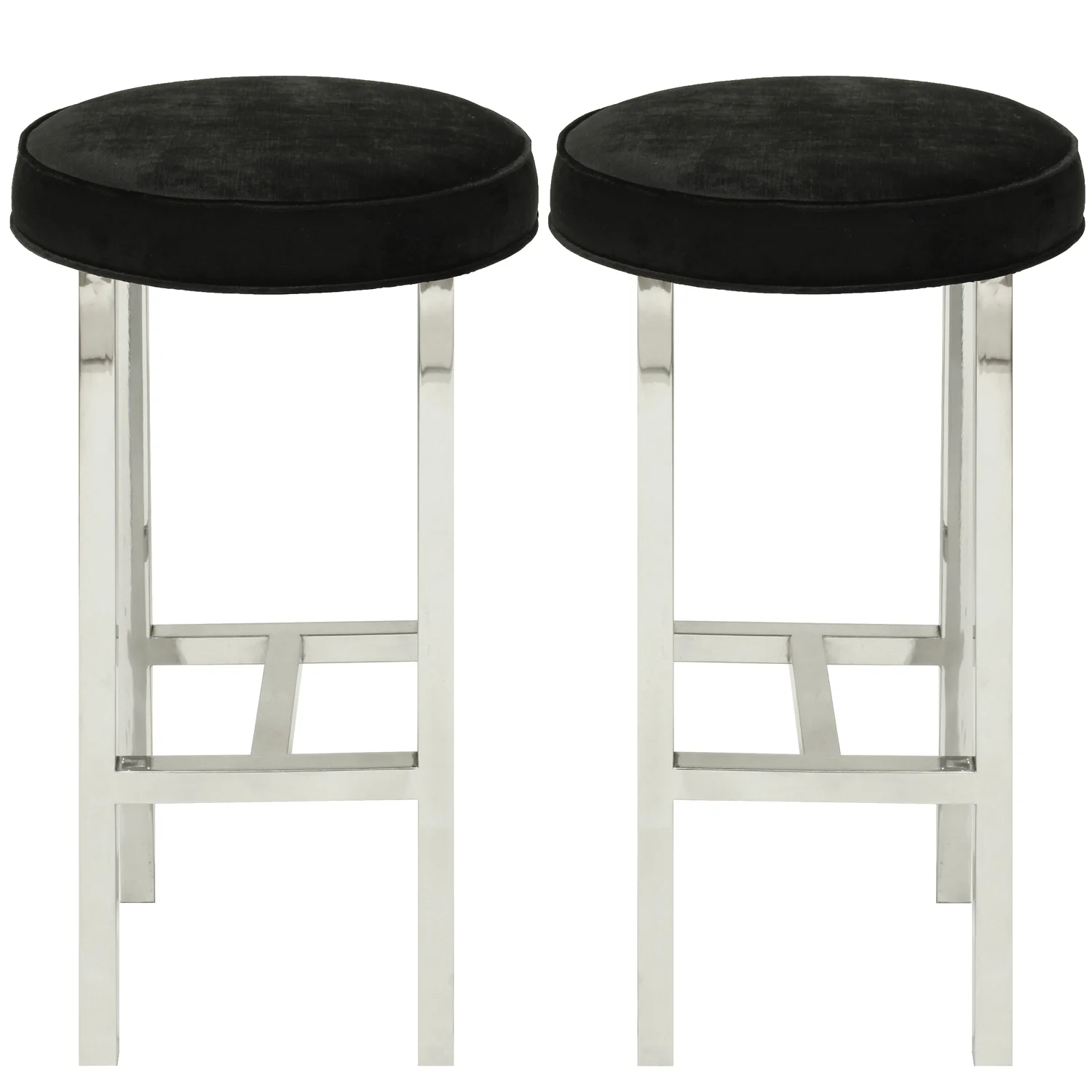 Pair of bar stools in polished stainless steel with adjustable glides by Pace Collection, American 1968 (original invoice on file). Reupholstered in black velvet.
