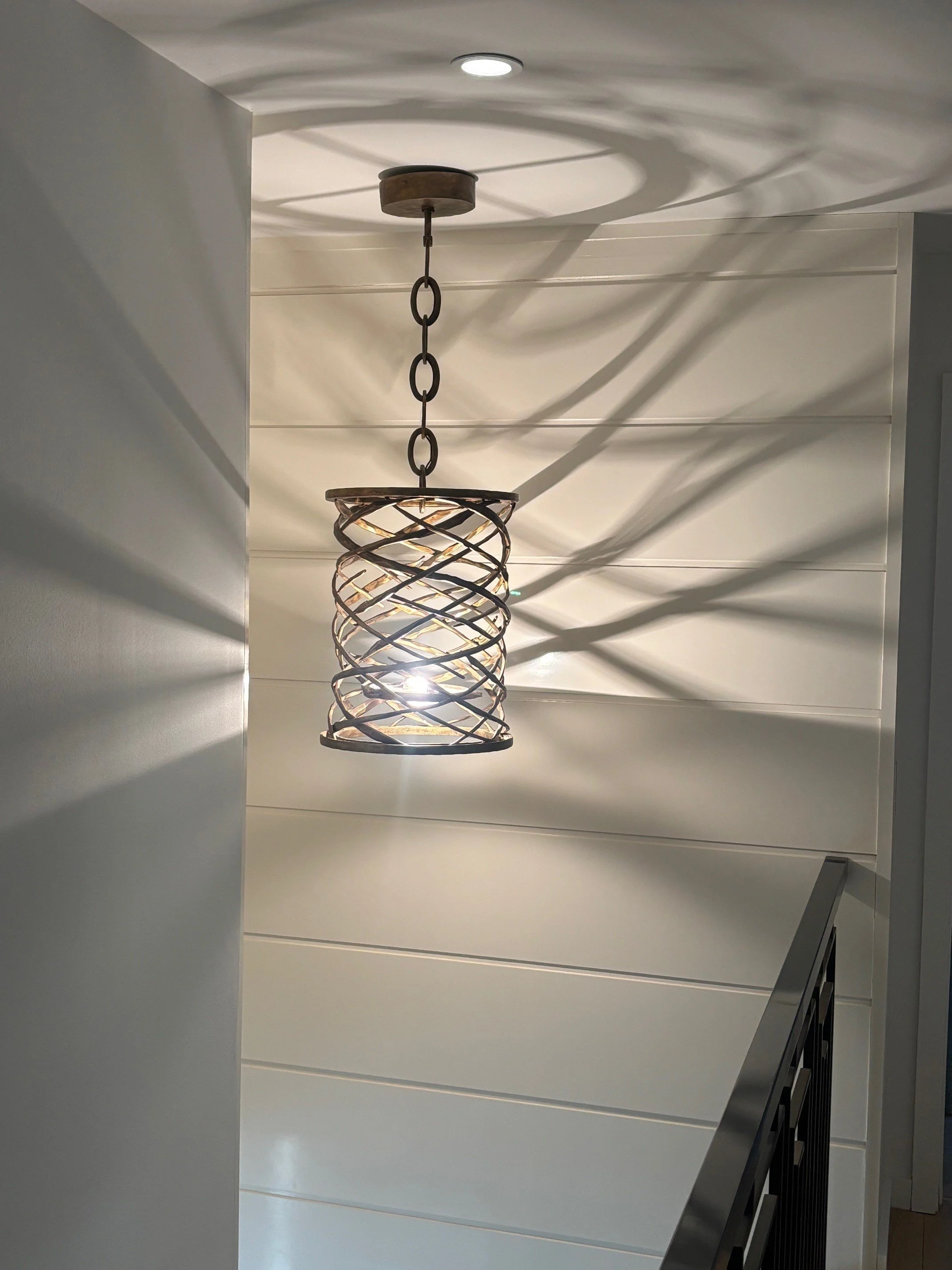 Rare sculpture pendant light “Lustre Tourbillon 285” in bronze with glass lens at bottom by Herve Van Der Straeten, France 2008 (signed). This light comes with the original invoice dated 10/22/2008. It is truly exquisite. The shadows cast on the walls when it is illuminated are magical.