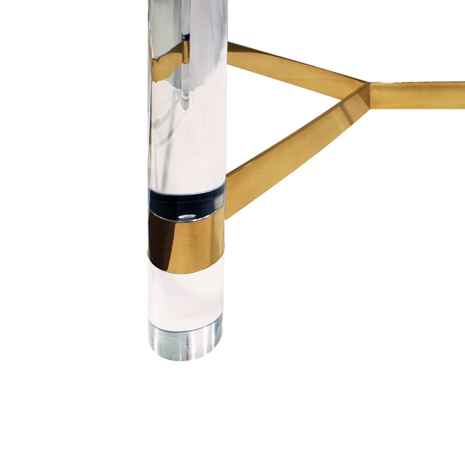 "Round Leg Lucite Coffee Table" with solid brass stretchers and top with inset glass top by Karl Springer, American 1980's (impressed signature on stretcher reads "Karl Springer"). Springer used only the most sumptuous materials and his craftsmanship is unsurpassed.
