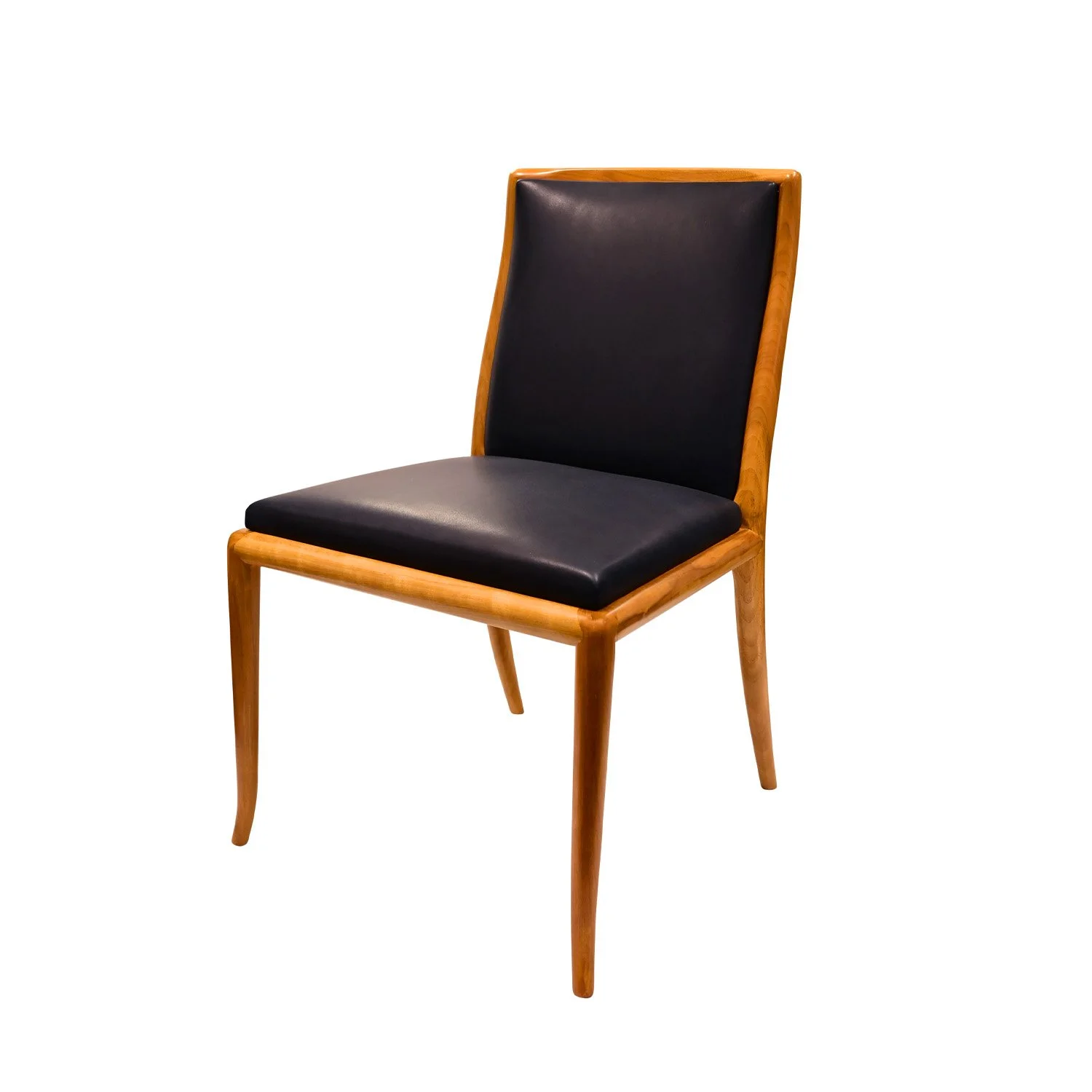 Set of 8 beautifully made dining chairs model 4208 in walnut with new dark blue leather upholstery by T.H. Robsjohn-Gibbings for Widdicomb, American 1950's. The beautiful gentle curve of the legs and backs along with fine craftsmanship are hallmarks of Robjohn-Gibbings’ superior design methodology. These have been refinished and reupholstered in fine blue leather.