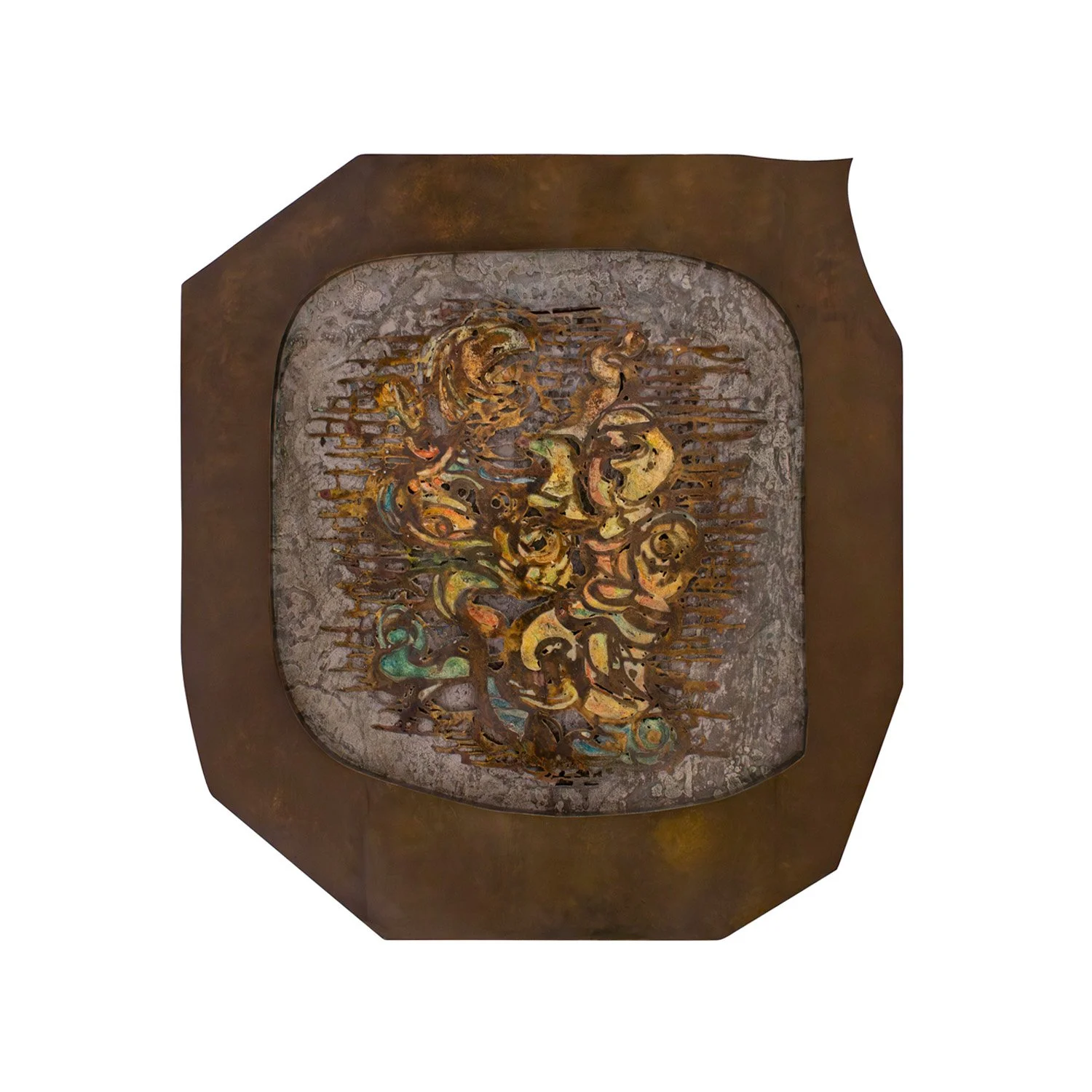 Magnificent and rare abstract collage "Dialogue" in patinated and engraved bronze and pewter with colorful enamel cloisonne and hand-brazed sculptured frame by Philip & Kelvin LaVerne, American 1960's (signed “Philip K. LaVerne” on front). The intricately hand-cut abstract elements add a dynamic sense of depth to the work. The LaVernes experimented with collages but they are rare. The back is covered in felt.