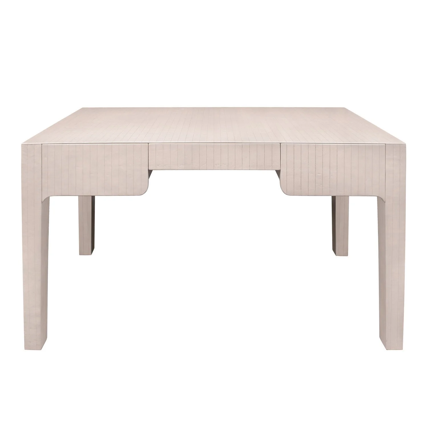 Meticulously crafted "Chinese Parson Style Desk" in scored off-white leather with three drawers by Karl Springer, American 1980's. This desk is superbly refined and very chic.