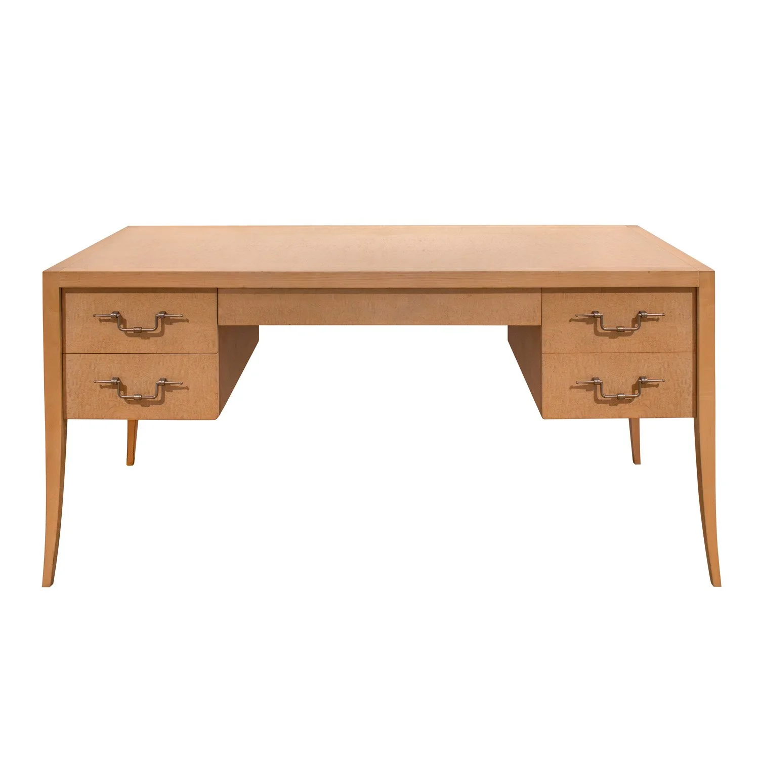 Elegant and rare desk in white ash burl with tapering legs and iconic engraved brass pulls by Tommi Parzinger for Parzinger Originals, American 1960's (Signed “Parzinger Originals” in drawer). The desk has two drawers on its left side, one deep drawer with filing compartments on the right, and a long drawer at center. This desk is beautifully refined. It is a testament to Tommi Parzinger’s chic sensibility and superb craftsmanship.