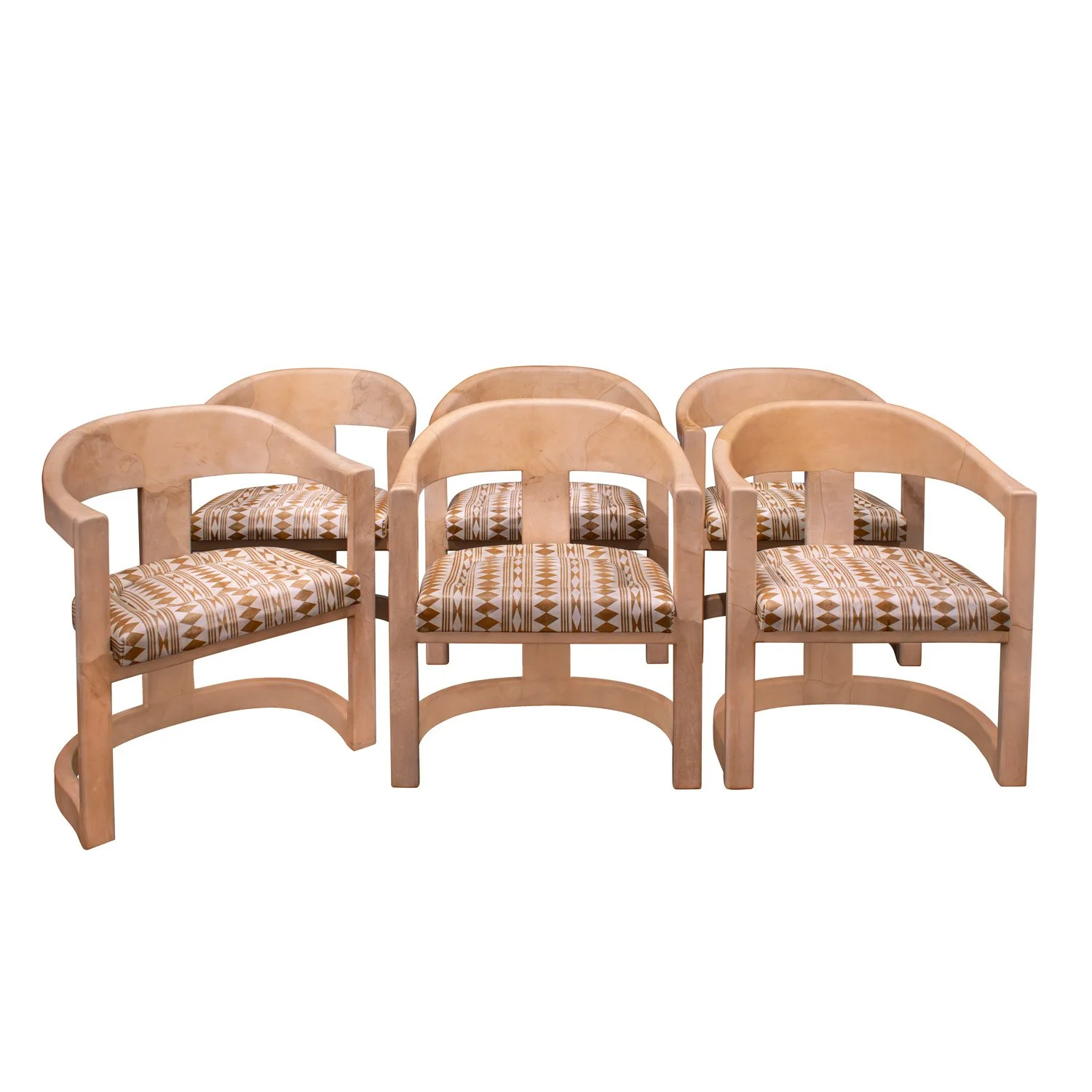 Magnificent set of 6 “Onassis Chairs” in lacquered goatskin with custom hand-printed leather seats by Karl Springer, American 1980's. The natural variations in the goatskin makes each one unique, like a work of art. Like all pieces by Karl Springer, these are beautifully crafted with remarkable attention to detail.