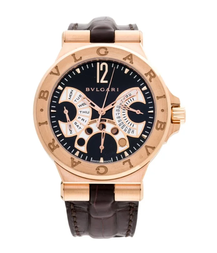 BVLGARI Diagono Day-Date Watch Reference 102026, 18K rose gold case on a brown alligator strap with a deployment clasp, automatic movement with day, date, moonphase and retrograde complications, engraved bezel, black dial, exhibition back, sapphire crystal. Excellent condition with certificate of authenticity, instruction manual, calendar setting tools, manufacturer's Box, official sales warranty.