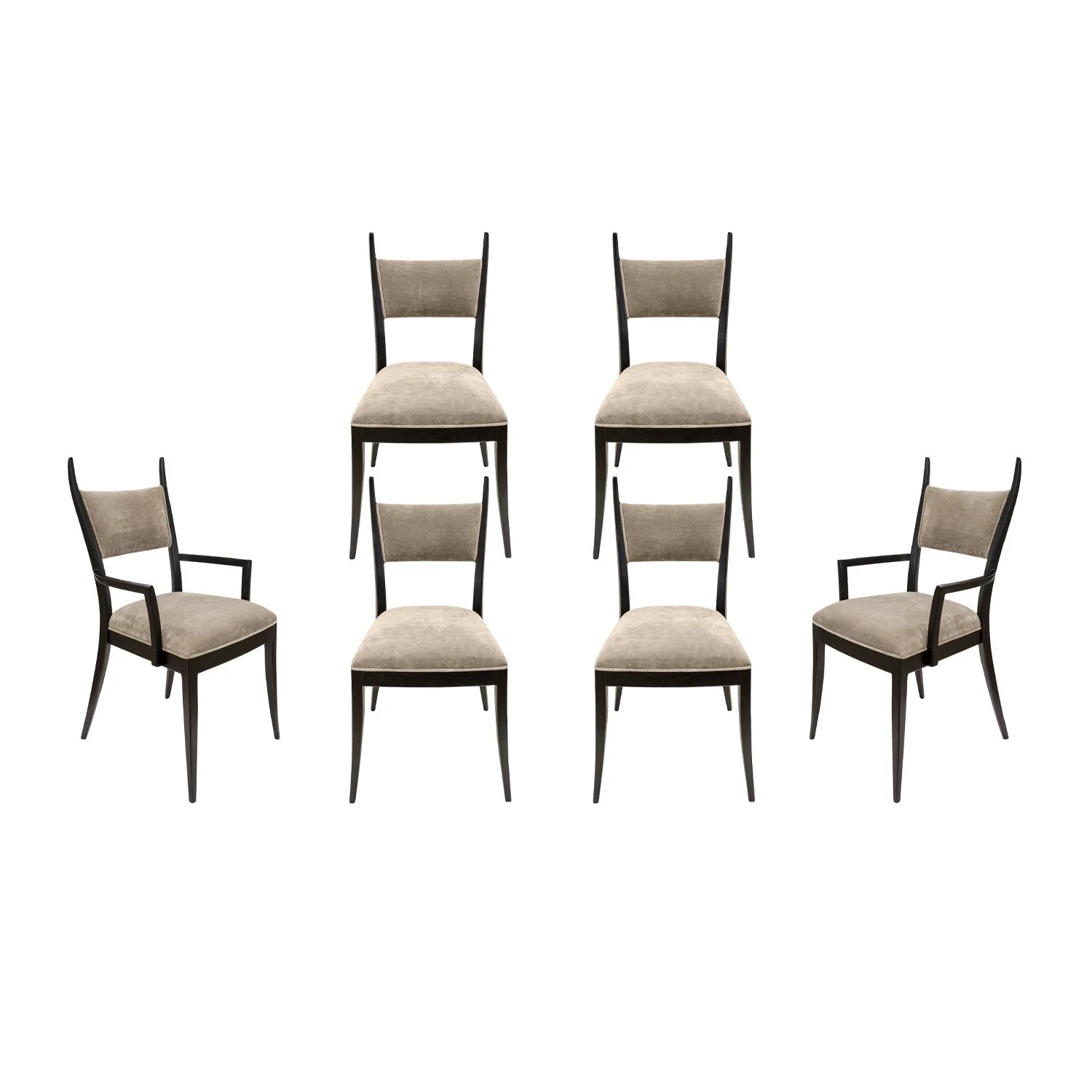 Set of 6 sculptural dining chairs, 2 arm chairs and 4 sides, models 1048 & 1048A, in ebonized mahogany with upholstered seats and back by Harvey Probber, American 1950's. This is an iconic Harvey Probber design. Refinished and reupholstered in a luxurious gray velvet by Lobel Modern. The curvature of the back makes these extremely comfortable.