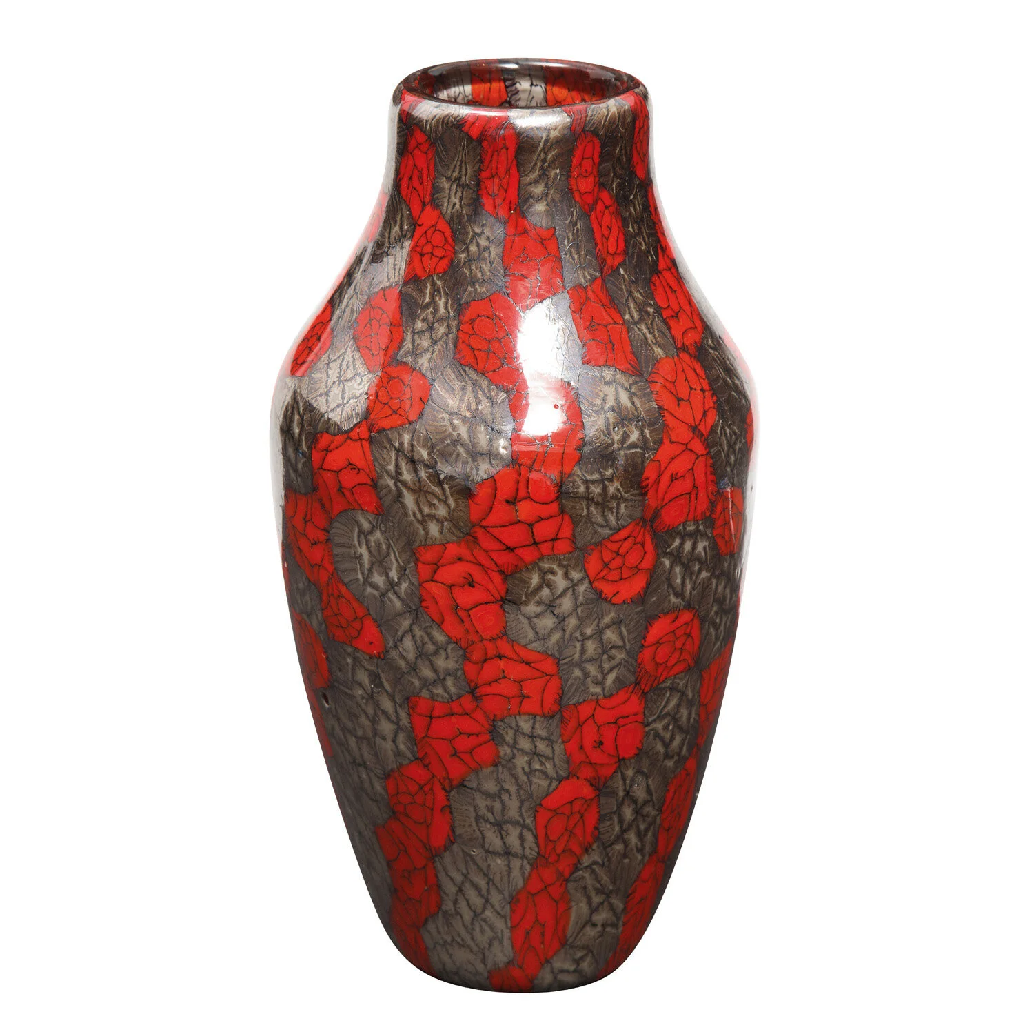 Hand-blown glass vase with unique red, orange, yellow and taupe murrine by Vittorio Ferro, Murano Italy, 1990’s. Vittorio Ferro, born in 1932, was a first rate glass master who spent many years working at Fratelli Toso in the 1950’s and 60’s, blowing some of their most important pieces. He always made his own unique murine. In 1963 he created a collection designed by Renato and Giusto Toso with which he participated in the Murano Glass Exhibition. In 1964 at the XXXII and in 1966 at the XXXIII Venice Biennale, works by him based on a design by Renato Toso were exhibited. In 1969 he won the "Borselle d'Oro" for the original drawings made with traditional techniques. He has received prestigious awards, collaborated with artists and designers, exhibiting in Italy, Japan, the USA. He taught in Finland, Nuutajarvi Glass Factory, and collaborated with the Abate Zanetti School of Glass. Vittorio died at the age of 80 in 2012.