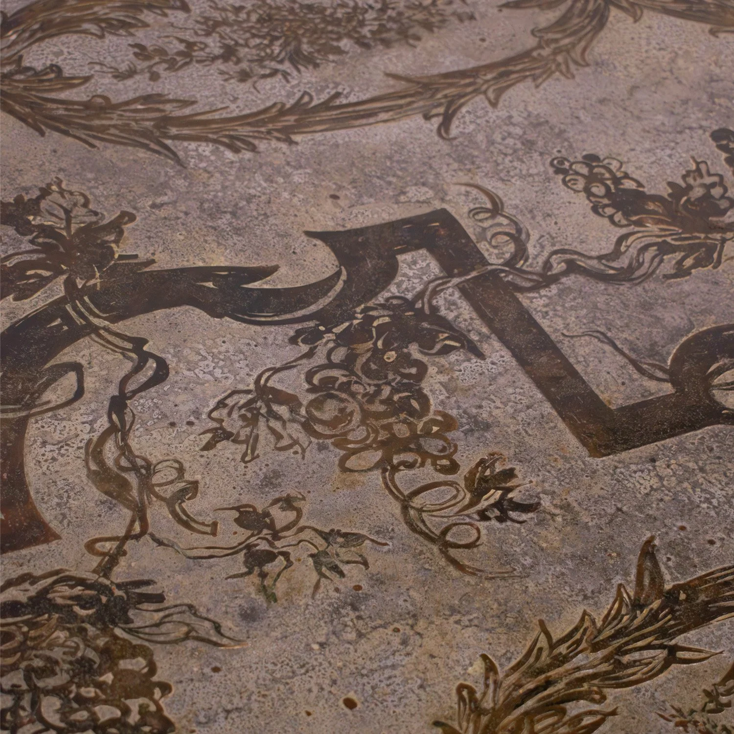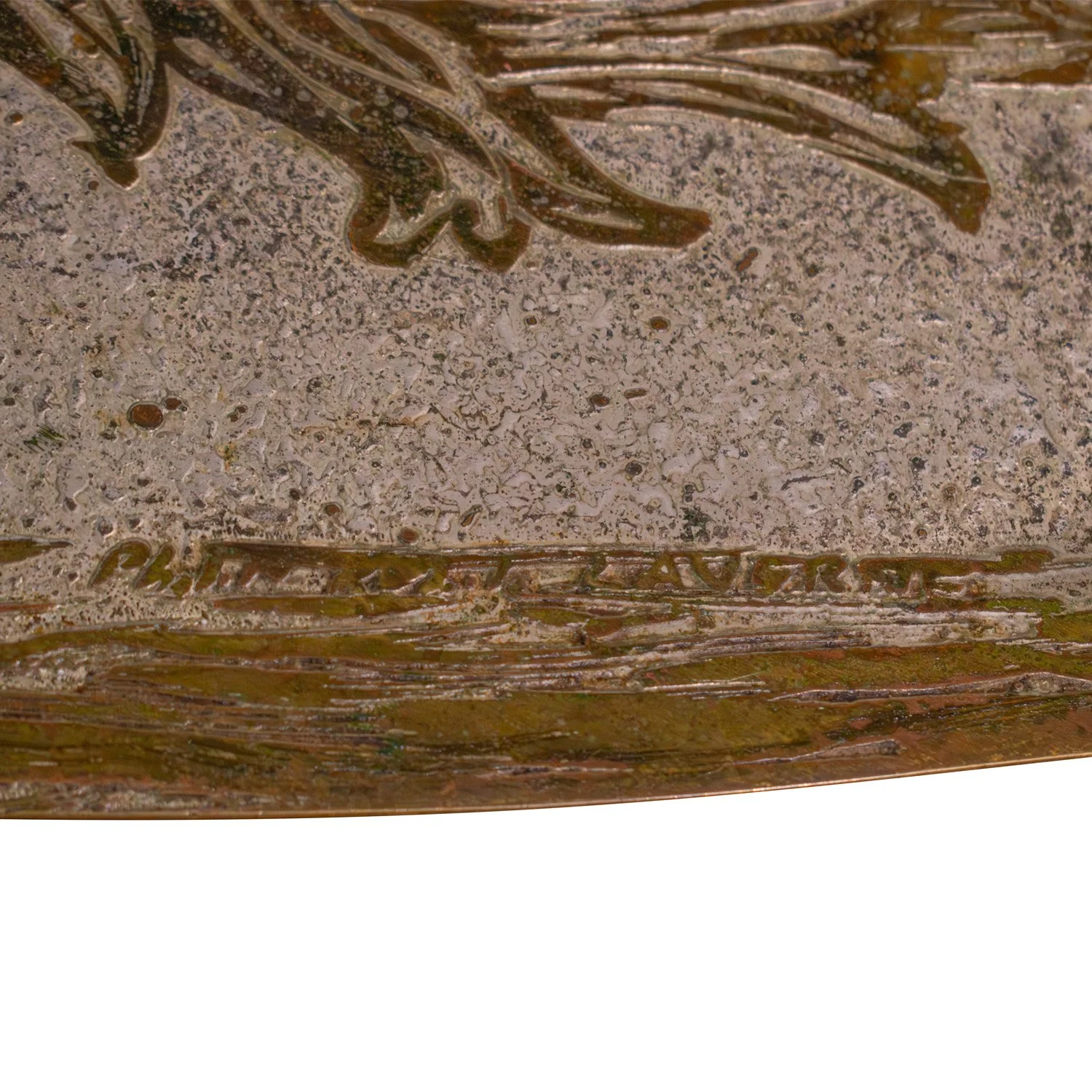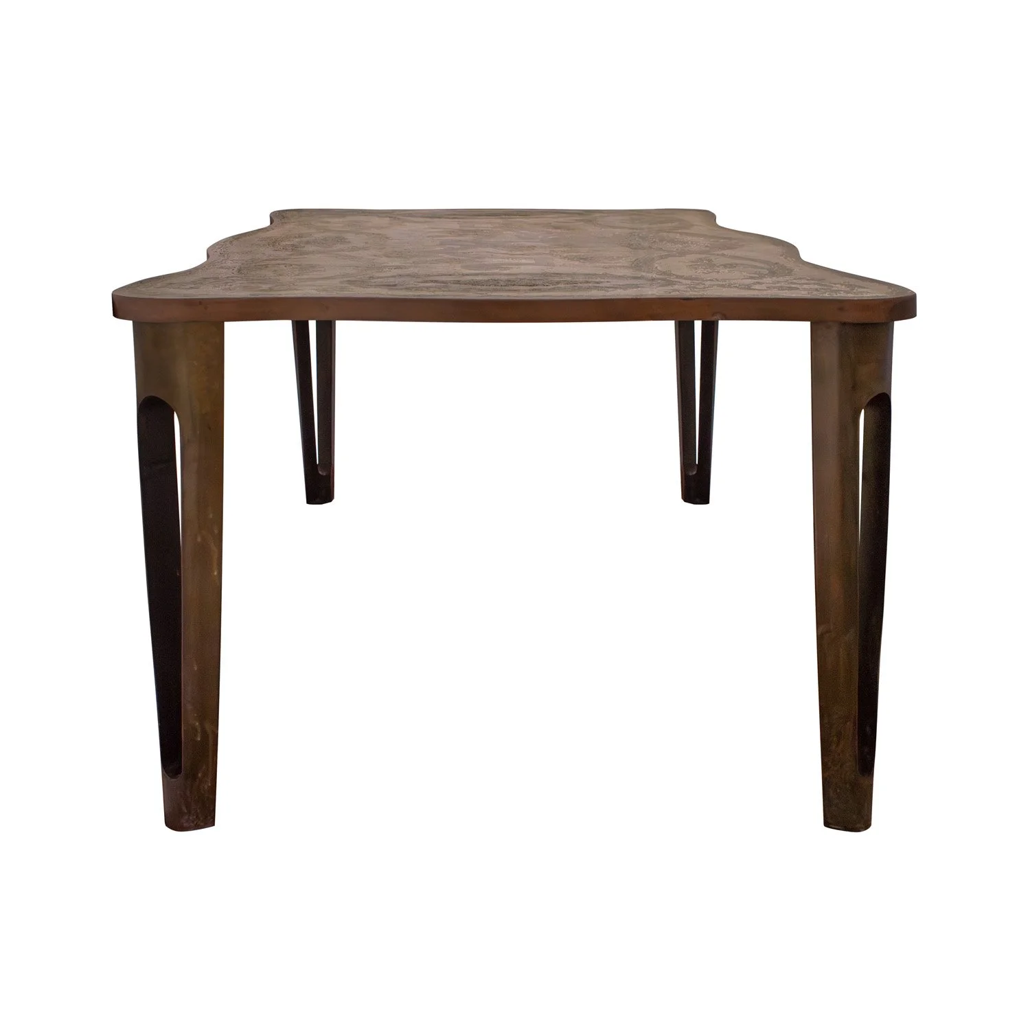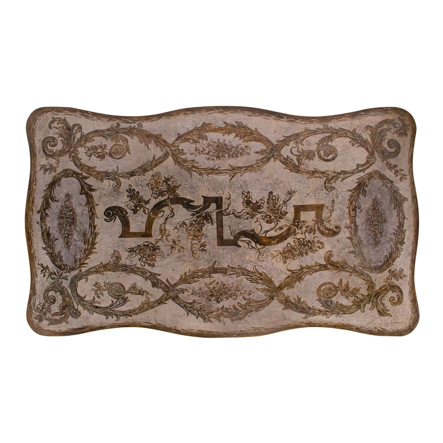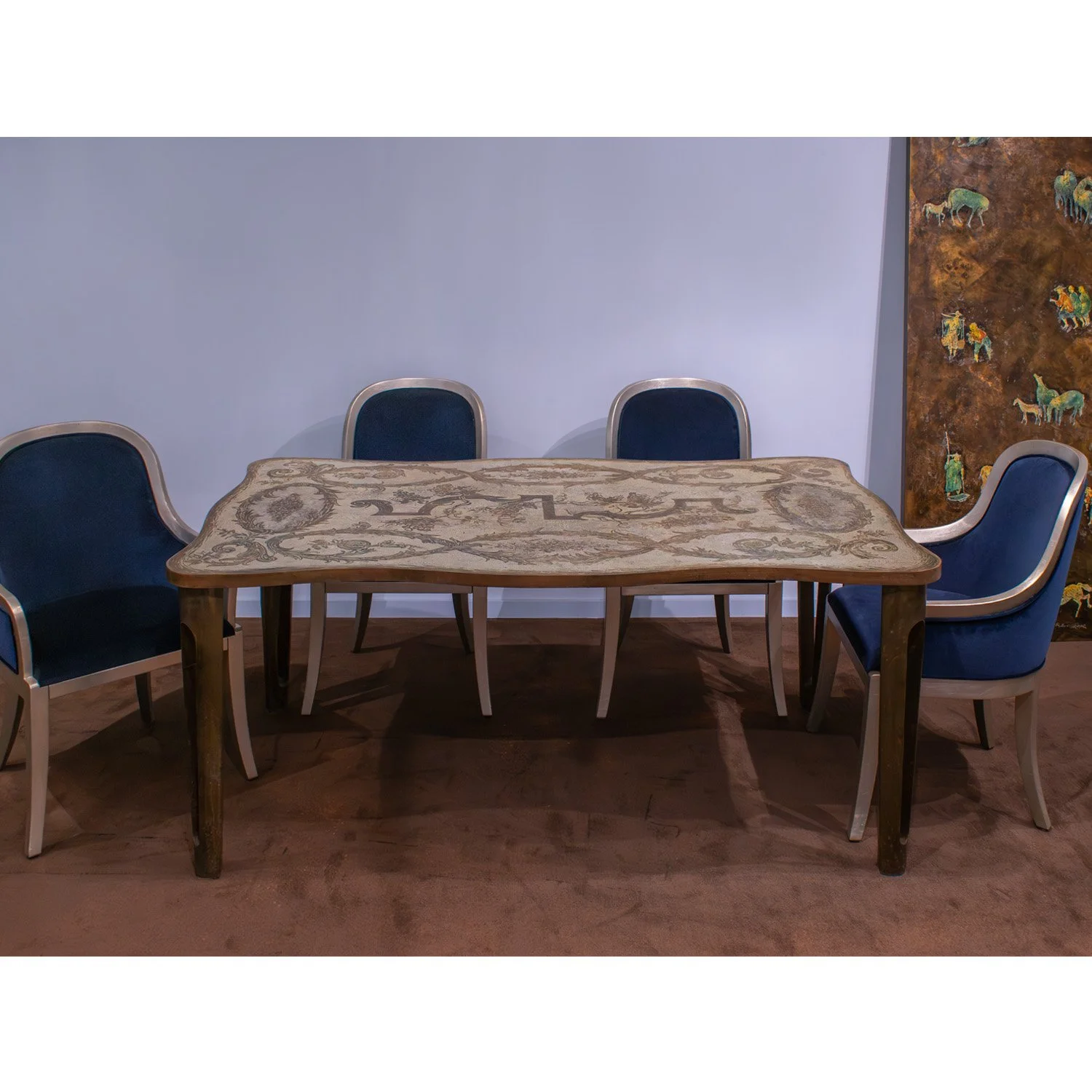 Unique and important "Aubusson" dining table with flowing wreath motif in patinated and engraved bronze and pewter with hand-painted green and blue enamels by Philip & Kelvin LaVerne, American 1960’s (Signed “Philip Kelvin LaVerne” on top). This table was designed by Kelvin and was inspired by 18th century French design. It is part of the LaVernes’ Abstract Series. The sculptural legs are dynamic and offer a sense of architecture with their negative space. This is a LaVerne masterpiece.