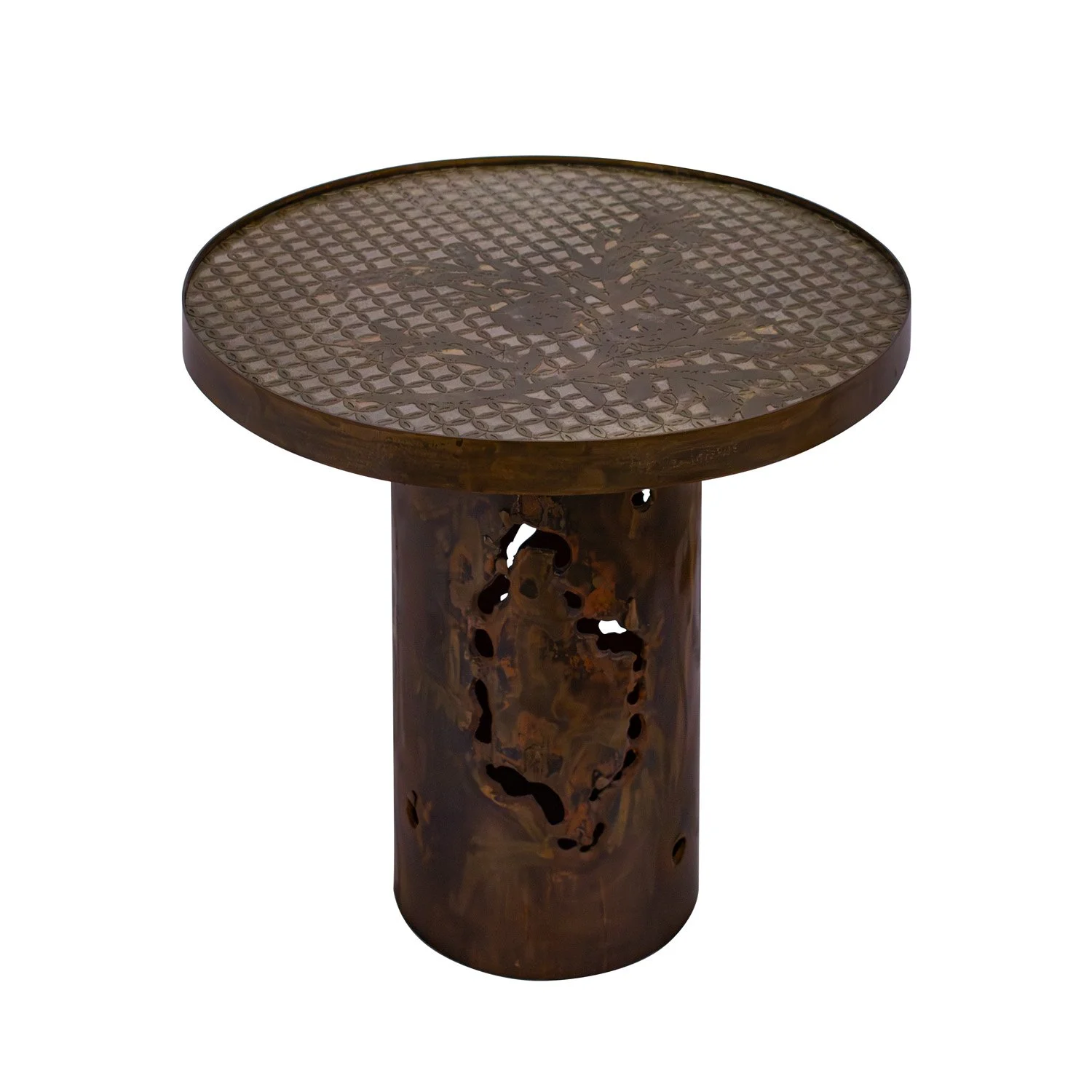 One-of-a-kind "Kuan Su" side table with top in patinated and engraved bronze and pewter with flower motif with hand-applied gold leaf and a welded abstract sculpture base by Philip and Kelvin LaVerne, American 1960's (signed “Philip Kelvin LaVerne” on side). The background of the top is engraved with the “Kuan” motif of interlocking circles, which is meant to evoke something from the past. The interior of the abstract base is lacquered red which can be seen through the negative space. This is a beautiful little LaVerne gem.