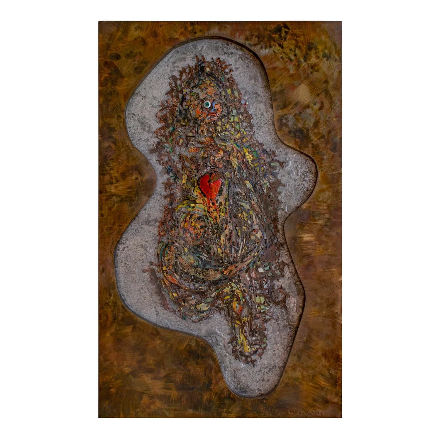 Magnificent and rare abstract collage "Dialogue" in patinated and engraved bronze and pewter with colorful enamel cloisonne and hand-brazed sculptured frame by Philip & Kelvin LaVerne, American 1960's (signed “Philip K. LaVerne” on front). The intricately hand-cut abstract elements add a dynamic sense of depth to the work. The LaVernes experimented with collages but they are rare. The back is covered in felt.
